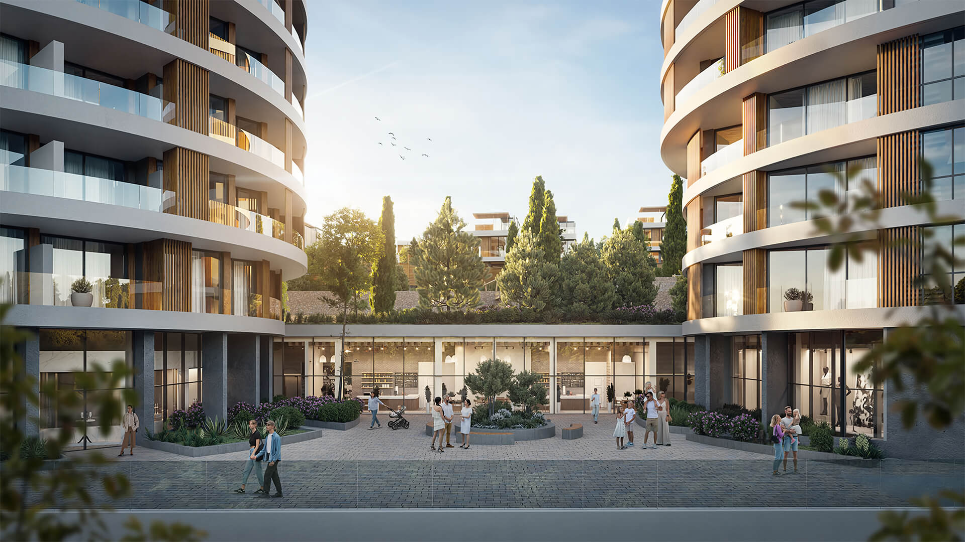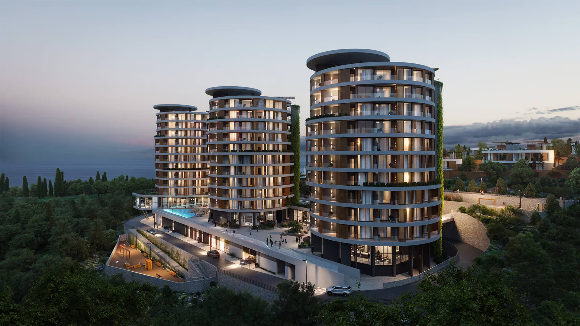 Пространство комплекса «Паруса мечты» продумано до мелочей: прогулочные аллеи, озелененные зоны отдыха, детские и спортивные площадки гармонично вписываются в природный ландшафт. Ландшафтный дизайн с акцентом на вечнозеленые растения подчеркивает природную красоту места и создает ощущение курортного комфорта круглый год.